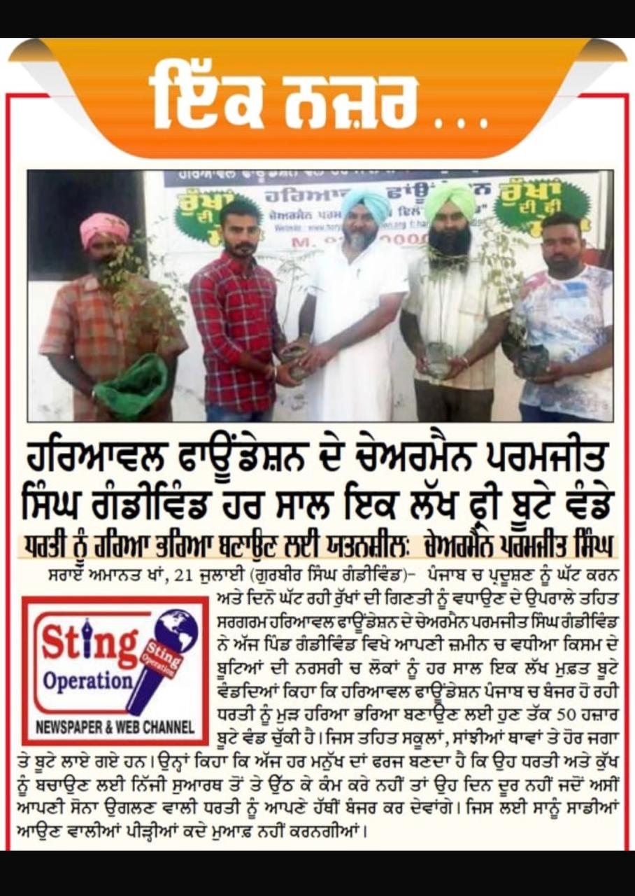 ਹਰਿਆਵਲ ਫਾਊਂਡੇਸ਼ਨ ਦੇ ਚੇਅਰਮੈਨ ਪਰਮਜੀਤ ਸਿੰਘ ਗੰਡੀਵਿੰਡ ਹਰ ਸਾਲ ਇਕ ਲੱਖ ਵੀ ਬੁਟੇ ਵੰਡੇ Punjabi News Skills Amritsar news, haryaval foundation, punjabi news, punjabinews Posted on July 22, 2025 ← ਵਾਤਾਵਰਨ ਬਚਾਉਣਾ ਹਰ ਮਨੁੱਖ ਦੀ ਮੁਢਲੀ ਜਿੰਮੇਵਾਰੀ ਹਰਿਆਵਲ ਫਾਊਂਡੇਸ਼ਨ ਰੁੱਖਾਂ ਦੀ ਪੈਦਾਵਾਰ ਵਧਾਉਣ ਤੇ ਸਾਂਭ ਸੰਭਾਲ ਲਈ ਹਮੇਸ਼ਾ ਯਤਨਸ਼ੀਲ ਰਹੇਗੀ: ਚੇਅਰਮੈਨ ਪਰਮਜੀਤ ਸਿੰਘ ਗੰਡੀਵਿੰਡ →